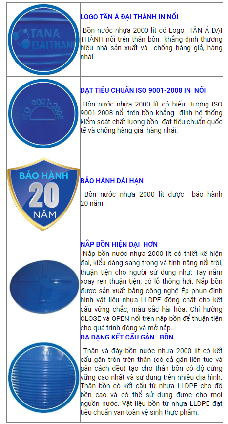 Bồn nước nhựa 2000 lít kết cấu 4 lớp, nhiều gân, tính chịu lực và đàn hồi cao, có độ bóng cao, nắp bồn có lỗ thông hơi thông minh, phù hợp với mọi nguồn nước và thích hợp lắp đặt trên các tàu thuyền, các khu công nghiệp hóa chất ... Kết cấu cút nước theo tiêu chuẩn phụ kiện bán ngoài thị trường, dễ dàng thay thế. Vật liệu làm cút ABS cứng, vững, vệ sinh.