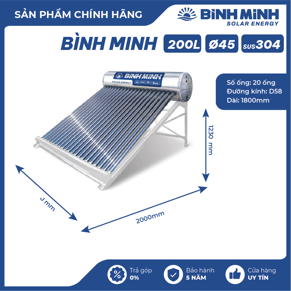Máy nước nóng năng lượng mặt trời 200L Bình Minh BM-200L là dòng sản phẩm được sản xuất từ những nguyên liệu chất lượng cao, áp dụng công nghệ Châu Âu để mang đến cho khách hàng một dòng sản phẩm hoàn hảo từ thiết kế đến chất lượng sản phẩm.