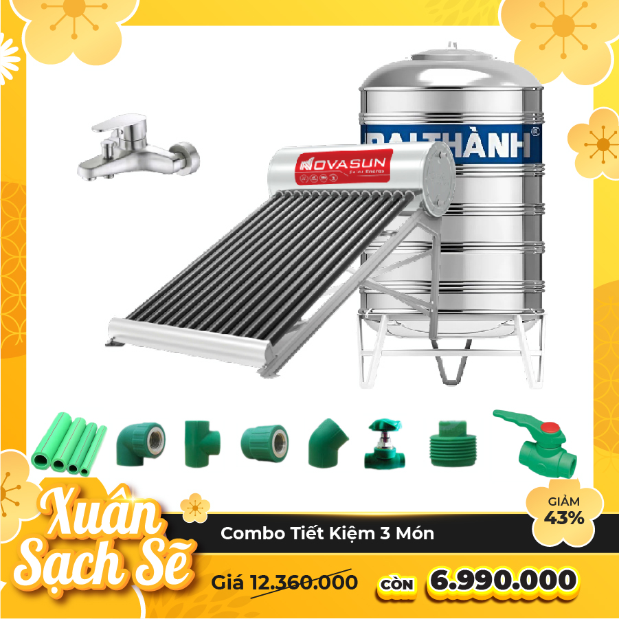 Nhằm giúp khách hàng tiết kiệm ngân sách, Nova Sun mang đến cho khách hàng bộ combo máy nước nóng năng lượng chỉ 6.990.000đ gồm 3 món chính và 1 bộ phụ kiện