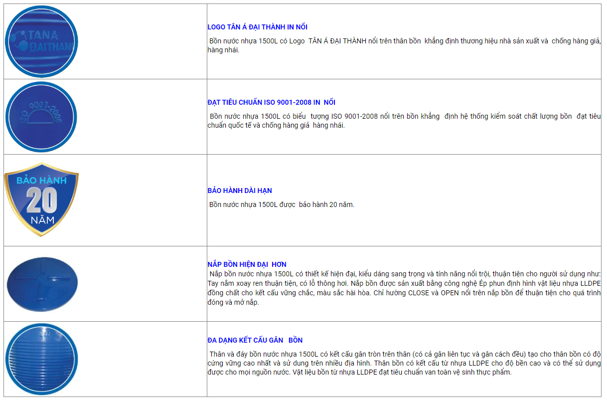 Bồn nước nhựa 1500L Đại Thành - Sản phẩm cao cấp của Tập Đoàn Tân Á Đại Thành được sản xuất trên dây chuyền công nghệ hiện đại bậc nhất châu Âu, bồn nước nhựa 1500L Thế Hệ Mới Đại Thành sở hữu những đặc tính độc đáo, kiểu sáng đẹp, mới lạ, tính an toàn và độ bền cao. Đây là sản phẩm hoàn hảo cho những công trình, chung cư cao cấp và những nơi có nguồn nước nhiễm phèn, nhiễm mặn, các vùng biển ... có thể sử dụng để đựng thực phẩm hoặc hóa chất. Hiện nay, tập đoàn Tân Á Đại Thành đã sản xuất các loại bồn lớn lên tới 10 khối. Đặc biệt, kết cấu lớp tăng tối đa khả năng chống ăn mòn, chịu va đập. Nguyên liệu hạt nhựa LLDPE được nhập khẩu từ Hàn Quốc, đảm bảo an toàn thực phẩm, cũng như tăng độ bền của sản phẩm.